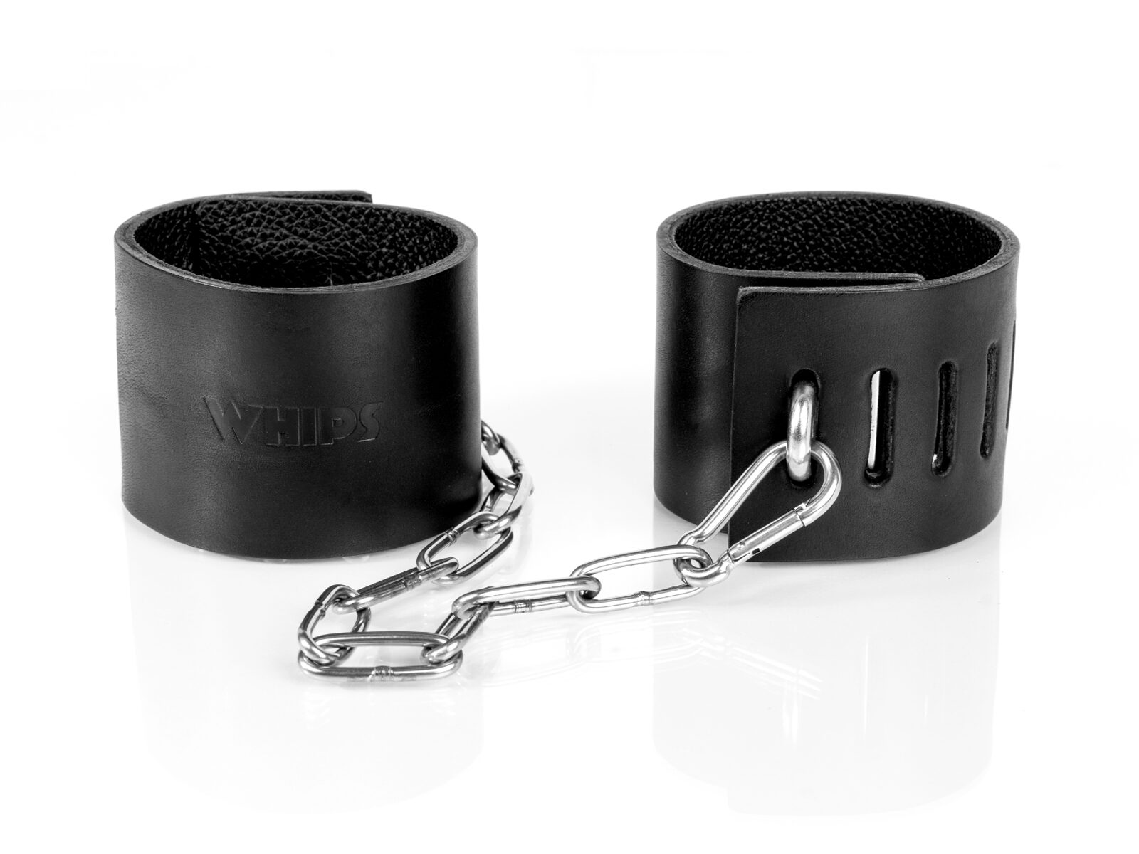 Nacięte otwory umożliwiają zapięcie kajdanek na mocny łańcuch lub zamknięcie ich na kłódkę, gdy sytuacja wymaga absolutnej pewności i symbolicznej nieodwracalności.