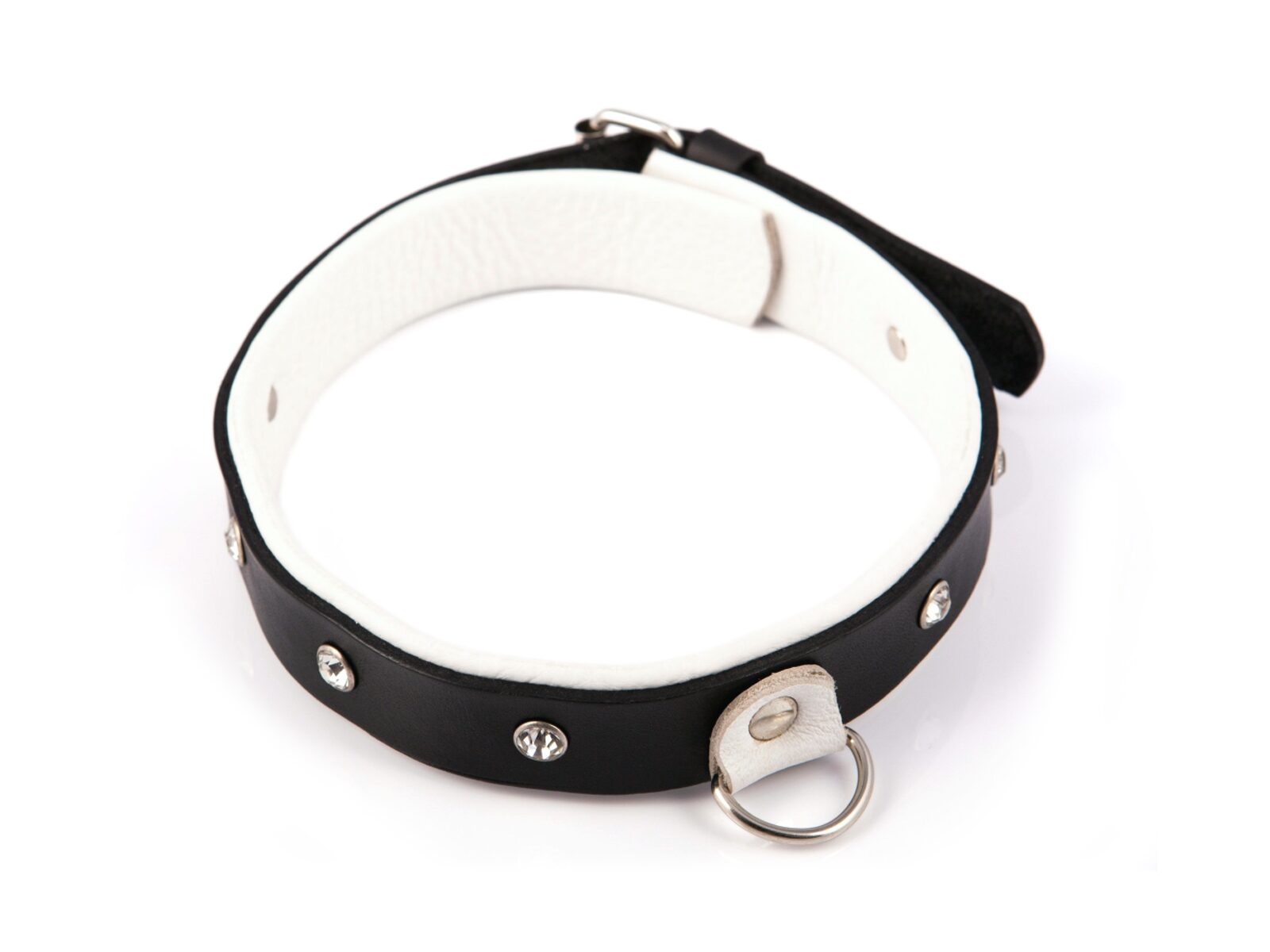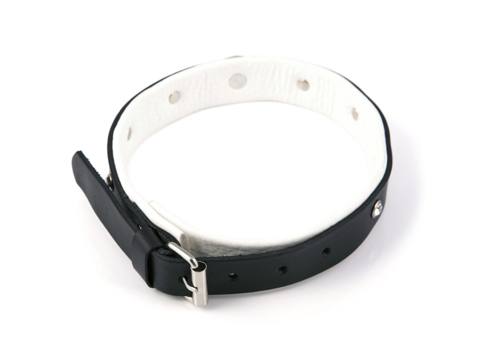 Obroża skórzana damska 3 cm z kryształami, czarno-biała